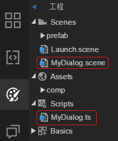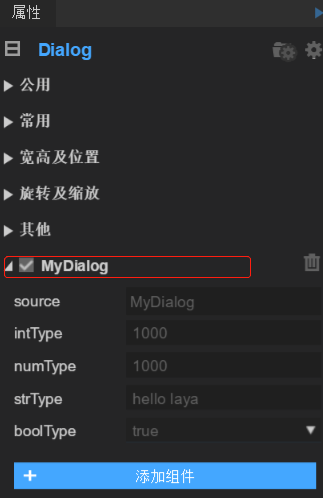 三、把MyDialog.ts脚本拖到MyDialog.scene的属性面板上