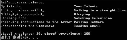 printf("\nsizeof mytalents: %zd, sizeof yourtalents: %zd\n",