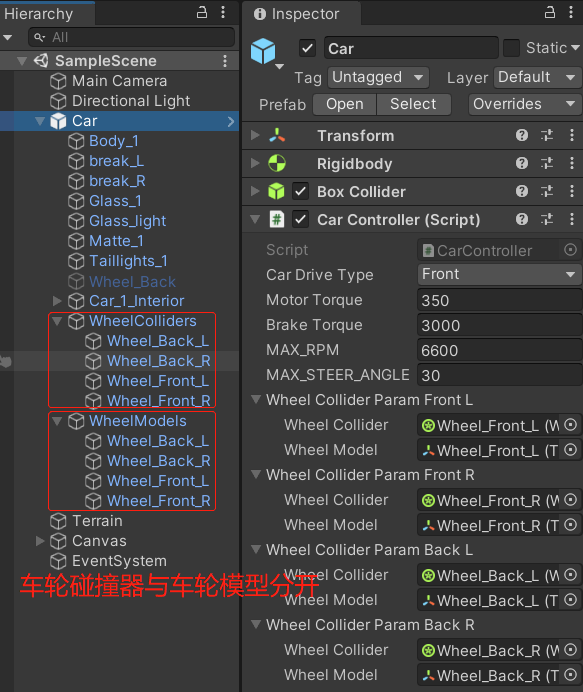 1、车轮模型与WheelCollider必须分开为不同的GameObject