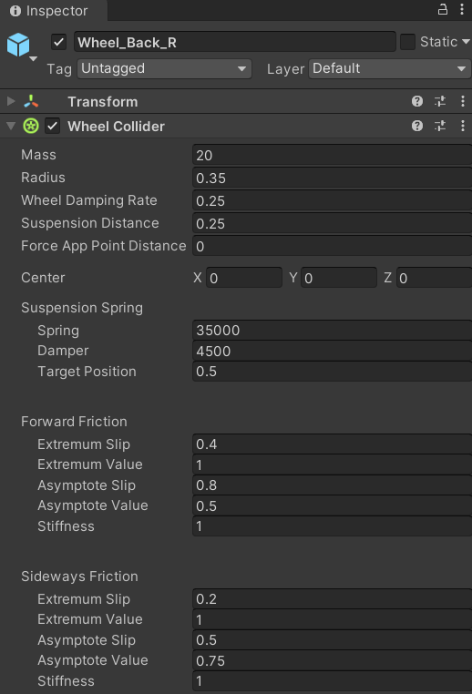 2、车轮模型不要挂MeshCollider(会影响WheelCollider与地面的接触)。
