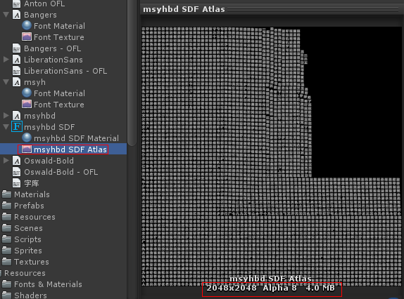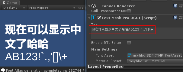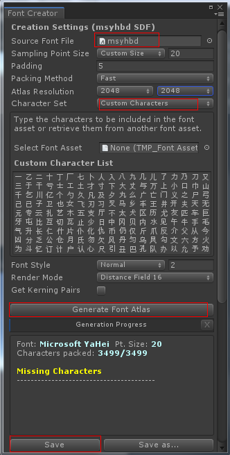 在网上找到常用汉字复制到Custom Character List中,点击Generate Font Atlas按钮,等待字体图集生成完成后再点Save按钮(会生成SDF文件)。