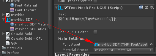 3、创建一个MeshTextPro Text并使用刚才生成的SDF文件