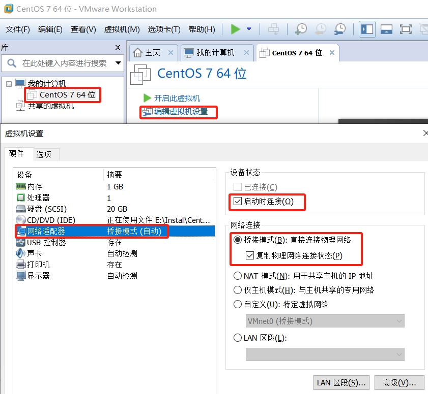 设置 CentOS 使用桥接模式上网,在桥接模式下 CentOS 与主机处在同一个局域网内,是一种平级关系。