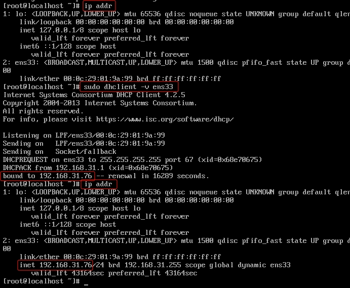 使用 ip addr 查看路由器给 CentOS 分配的IP,如果未打印出正确的 IP,再使用 sudo dhclient -v ens33 命令手动触发DHCP请求。