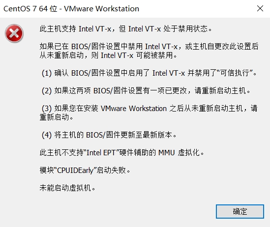 如果未在BIOS中开启CPU虚拟化技术,启动时会报错: