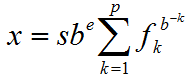 接下来,假设符号为正,基数b是2,p是7(即,用7位二进制数表示),指数是5,待储存的有效数是1011001。下面,根据上面的公式构造该数: