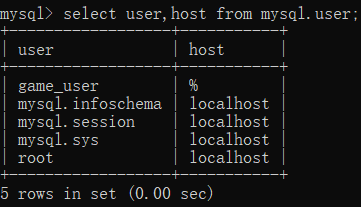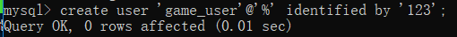 创建用户: create user 'game_user'@'%' identified by '123';