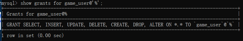 查看用户获得的权限: show grants for game_user@'%';
