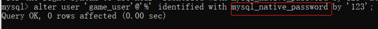 alter user 'game_user'@'%' identified with mysql_native_password by '123';