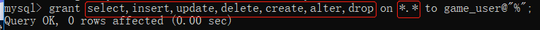 给用户授权: grant select,insert,update,delete,create,alter,drop on *.* to game_user@"%";