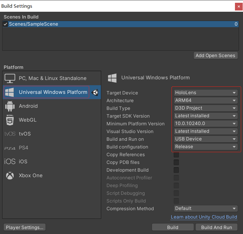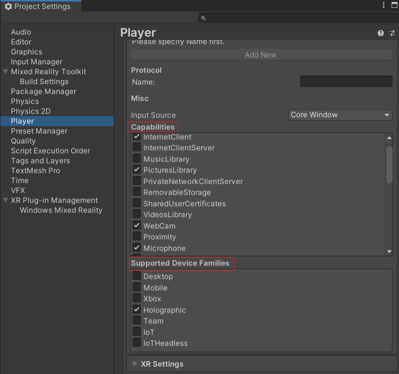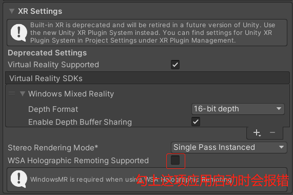 坑:如果勾上 WSA Holographic Remoting Supported ,程序启动时会报错,如图: (Unity 2019.4.19测试)