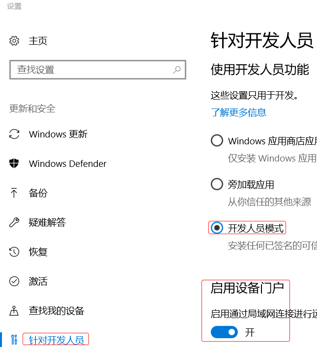 1、Windows中设置开发人员模式 (设置->更新和安全->针对开发人员->开发人员模式)