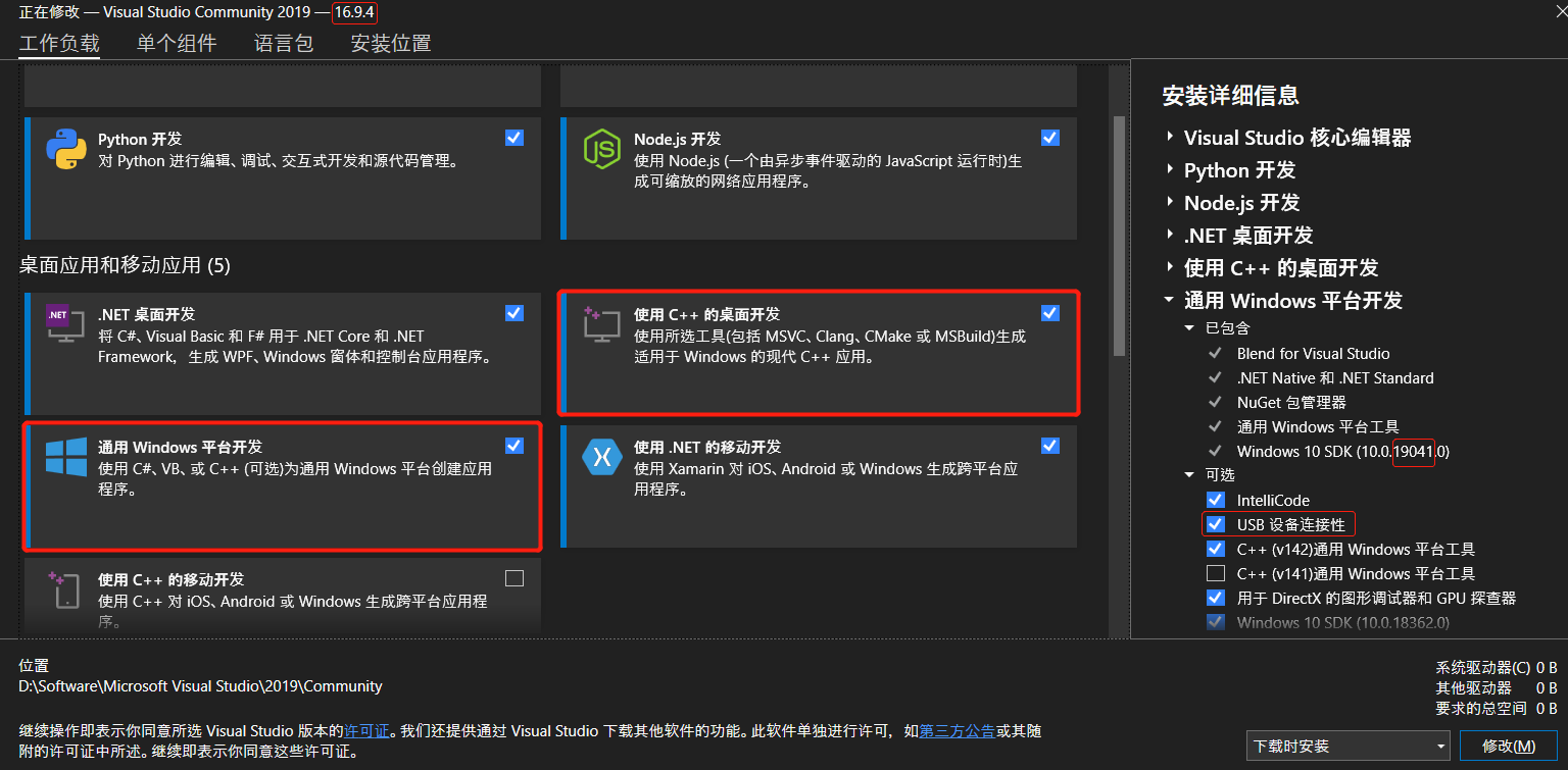 2、安装Visual Studio必要组件(需要Visual Studio 2019 16.2或更高版本)