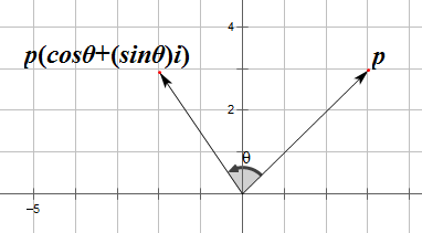 复数集存在于一个2D平面上,可以认为这个平面有两个轴:实轴和虚轴。这样,就能将复数(x, y)解释为2D向量。用这种方法解释复数时,它们能用来表达平面中的旋转(虽然这走了一个弯路)。看看复数p绕原点旋转角度θ的情况。