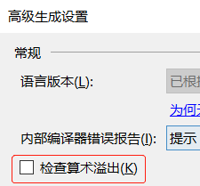 Microsoft Visual Studio 中更改Checked设置(项目属性->生成->高级->勾选检查算术溢出)