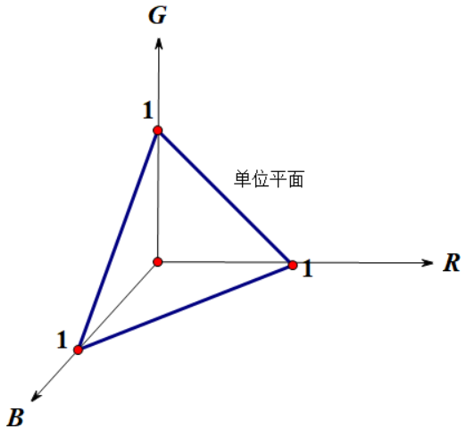 根据用三原色基准光组合成一个任意颜色光的这一特性,可以沿着正交坐标轴画出每个基准光的值,所形成的空间可以称为三原色基准空间。任意颜色均可以由这个三原色基准空间中的一个矢量表示,即以坐标系原点为起点,分量为rR、gG和bB的矢量。矢量与单位平面的交点代表为获得颜色所需要的相对权因子,相对权因子又称为色度值或者色度坐标。