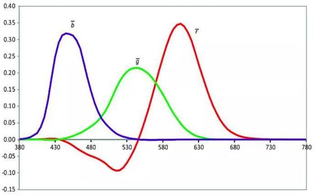 如果把r、g、b这些值视为坐标系的纵坐标,光的波长视为横坐标,则下图表示它们之间的关系: