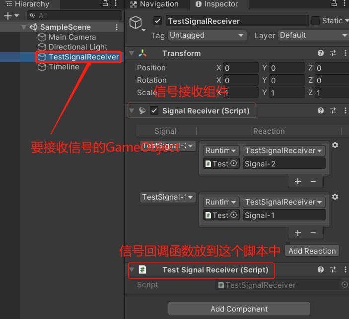 在希望接收信号的对象上挂上信号接收器组件(SignalReceiver)和自己定义的用来处理信号的脚本(如这里的TestSignalReceiver.cs),并在SignalReceiver组件中为希望接收的不同信号设置回调函数。