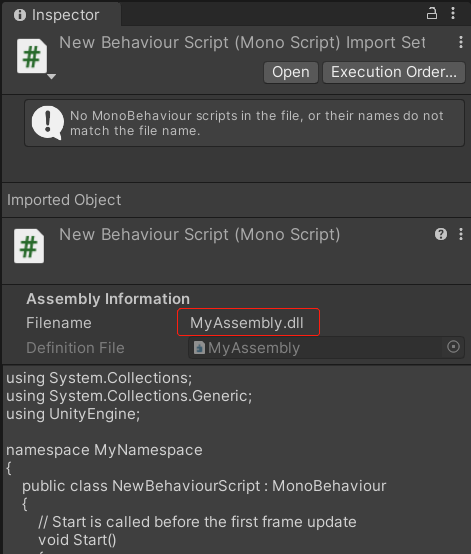 MyAssembly文件夹(包含子目录)下创建的所有脚本会被编译到MyAssembly程序集中。