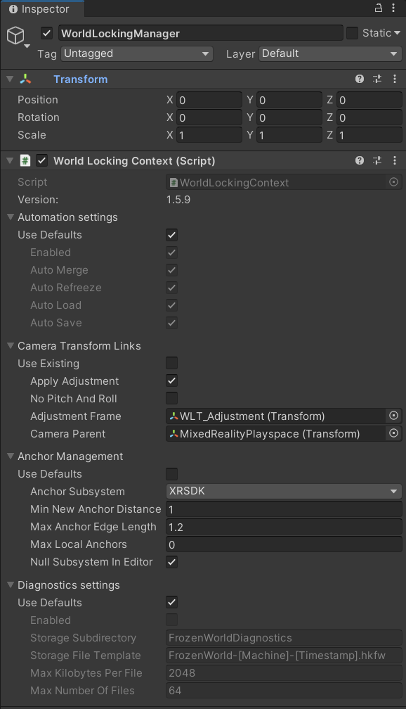 WorldLockingContext 为场景提供世界锁定(WorldLocking)功能的中心组件。该组件放置在场景中的单独GameObject上。