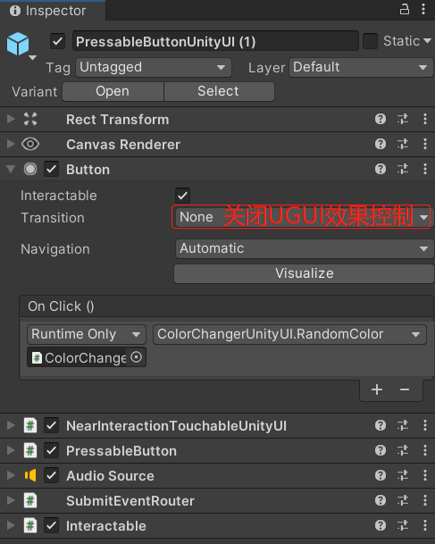 需要关闭UGUI对按钮的效果控制,按钮效果由PressableButton组件控制。
