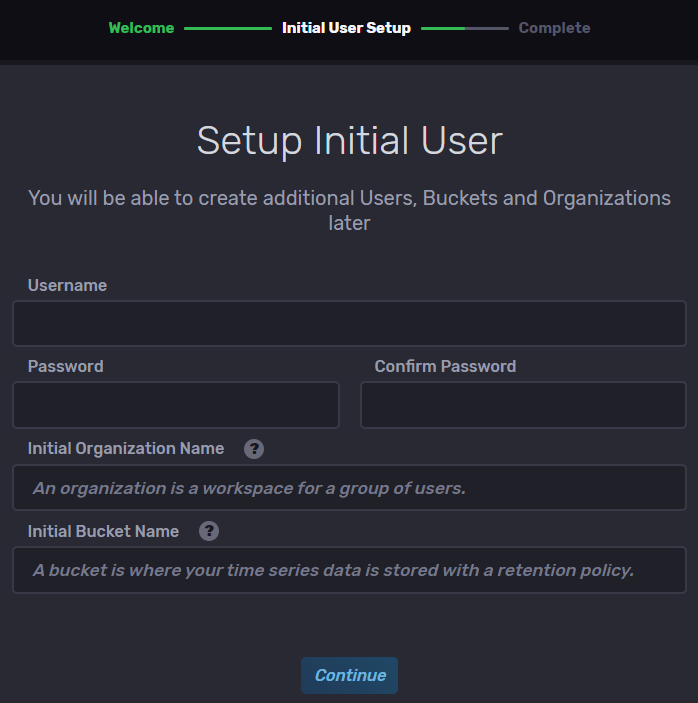 首次使用InfluxDB时,需要初始化用户设置,登录后台会自动提示进行初始化设置。如图