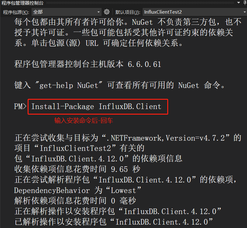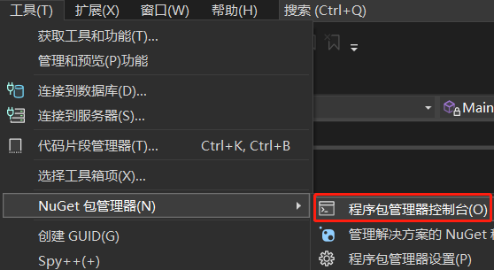 [工具]->"NuGet 包管理器"->"程序包管理器控制台"
