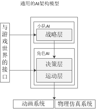运动层与决策层包含的算法是针对单个角色的,战略层是针对小队乃至更大规模群体的。这只是一种基本的AI架构模型,实际中,根据游戏的种类和需求,可能会有所细化或增删。