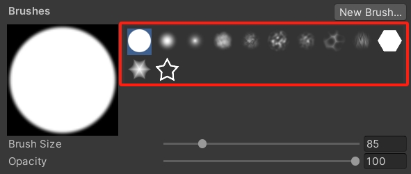 使用 Stamp Terrain 工具可以选择现有画笔并只需单击即可应用画笔。每次单击都会以所选画笔的形状将地形升高到设置的 Stamp Height。要将 Stamp Height 乘以一个百分比,请移动 Opacity 滑动条以更改其值。例如,__Stamp Height__ 为 200 且 Opacity 为 50% 时,每个标记的高度设置为 100。