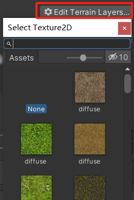 在使用 Paint Texture 工具之前,需要先创建地形层,点击 [Edit Terrain Layers...] 按钮,选择 Create Layer ,此时会弹出一个纹理选择界面,双击其中一张纹理,即可创建新的地形层。添加的第一个地形图层将使用配置的纹理填充您的地形。每个瓦片支持的地形层数由使用的渲染管线决定。