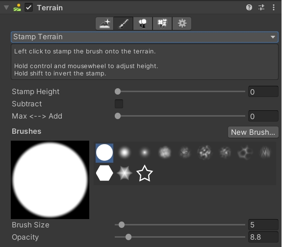 使用 Stamp Terrain 工具可在当前高度贴图之上标记画笔形状。