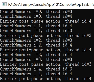 Console.WriteLine("Barrier post-phase action, thread id={0}",