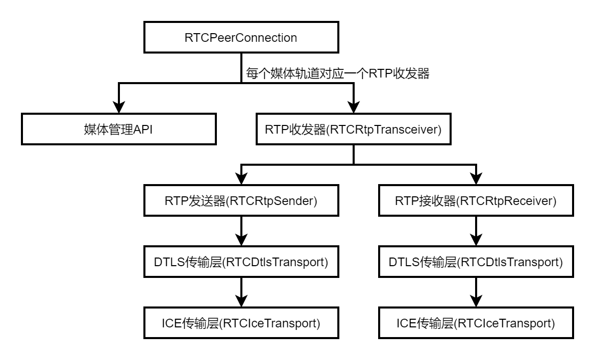 WebRTC在 RTCPeerConnection 扩展接口中提供了API对上述过程进行管理,这些API包括媒体流及媒体设置、RTP 传输层两个主要部分,其结构如下图所示。