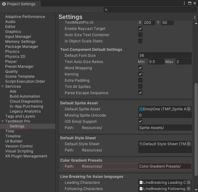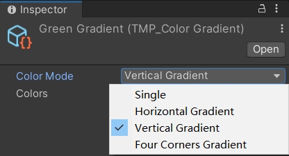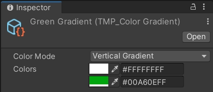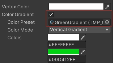 将 GreenGradient.asset 拖到 TextMeshPro 组件的 Color Preset 属性上。
