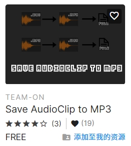 要想将 AudioClip 转成 MP3 文件,需要从Unity资源商店中下载 Save AudioClip to MP3 插件。Lame-For-Unity