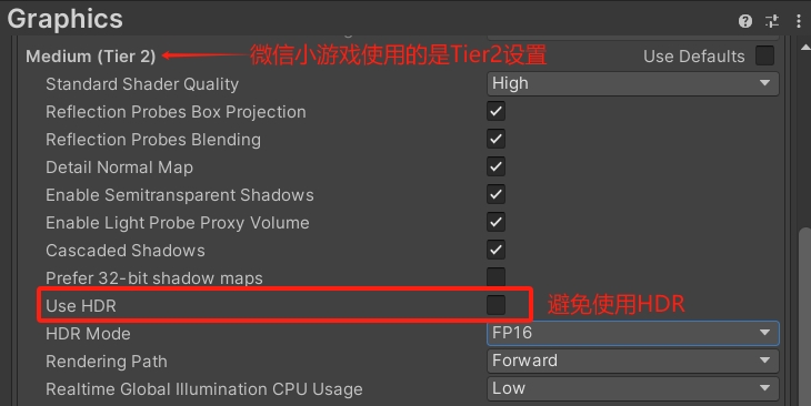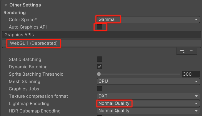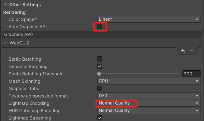 取消勾选 Auto Graphics API,仅保留 WebGL 1 或者 WebGL 2。可以减少shader变体数量,从而减小首包和启动时间。使用 WebGL 1 时, 若 Lightmap Encoding 为 High Quality,将其改为 Normal。