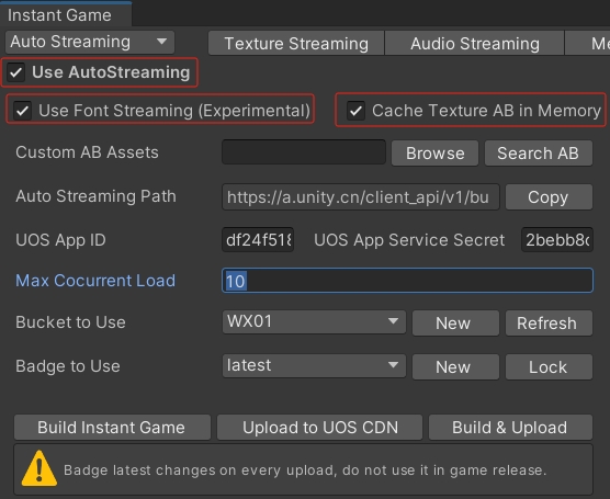 InstantGame 窗口位于 Windows → Auto Streaming,该窗口包含了打包小游戏前的资源 Streaming 设置,以及上传云资源到 UOS CDN 的设置。