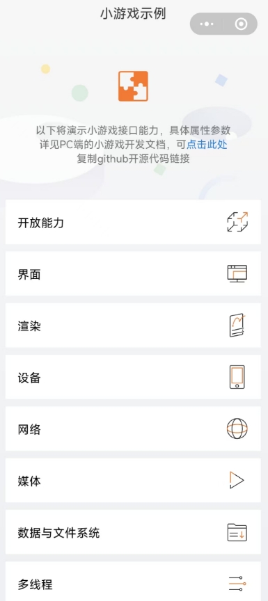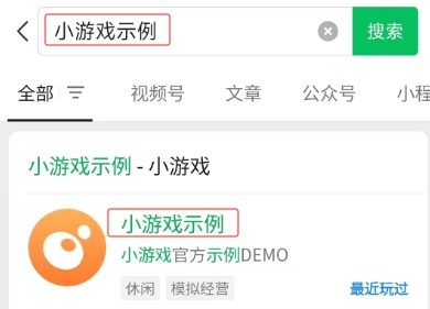 微信搜索“小游戏示例”。官方小游戏展示了所有游戏能力接口。