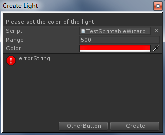 ScriptableWizard.DisplayWizard<TestScriptableWizard>("Create Light", "Create", "OtherButton");