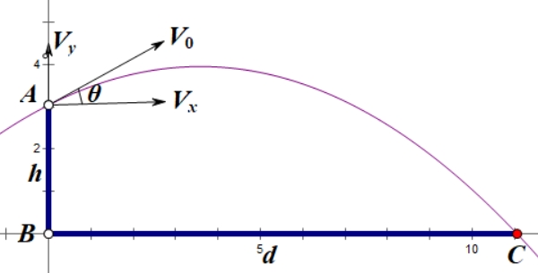 如上图所示,从A点以θ角向前投掷物体,刚好落在C点,已知高度h、距离d、重力加速度g,求初始速度V0等于多少?