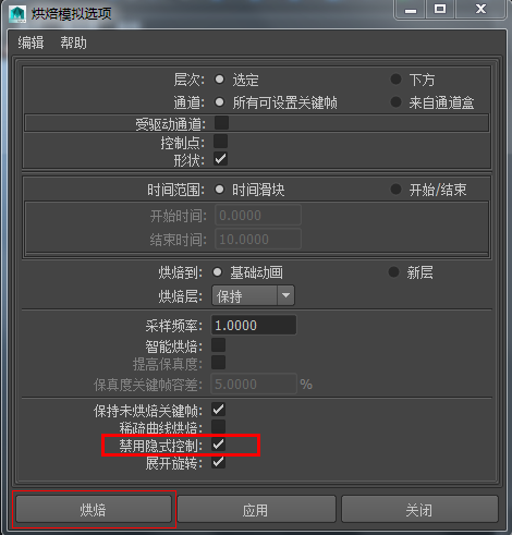 (5) 【编辑】|【关键帧】|【烘焙模拟】对动画进行烘焙 (只有经烘焙后的动画(FBX)在Unity中才能播放)