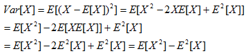 注意,因为E[X]是实数而不是随机变量,E2[X]也是实数,所以有E[E2[X]]=E2[X]。等式E[XE[X]]=E2[X],其中a=E[X]。重写等式得到随机变量平方的期望的一个表达式:E[X2]=Var[X]+E2[X]