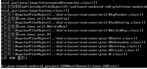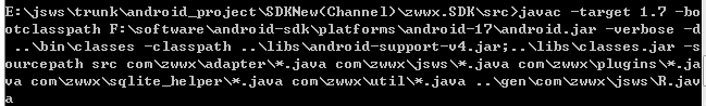 javac -target 1.7 -bootclasspath F:\software\android-sdk\platforms\android-17\android.jar -verbose -d ..\bin\classes -classpath ..\libs\android-support-v4.jar;..\libs\classes.jar -sourcepath src com\zwwx\adapter\*.java com\zwwx\jsws\*.java com\zwwx\plugins\*.java com\zwwx\sqlite_helper\*.java com\zwwx\util\*.java ..\gen\com\zwwx\jsws\R.java