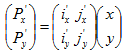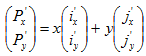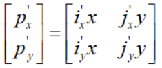 设x方向的基向量为i=(1,0),y方向的基向量为j=(0,1)。将这两个基向量组合,就可以将任意坐标(x,y)表示为xi+yi的形式。这样一来,即使不更改x、y,而只是将i、j旋转指向特定的方向,也可以实现物体的旋转。将基向量i、j旋转后得到一对新的基向量i'与j'。然后进行向新坐标系的坐标变换,坐标为(x,y)的点P,即P=xi+yj这个点,就移动到了点P'=xi'+yj'。可将其用分量表示为