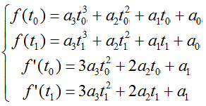 已知表示一条曲线的某个函数f(t)在两点t0、t1的函数值f(t0)、f(t1)和一阶导数值f'(t0)、f'(t1),求三次多项式P(t):