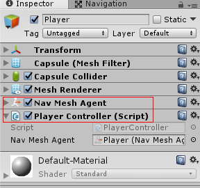 3、创建一个Capsule,并挂上NavMeshAgent组件以及一个自己写的用于控制玩家移动的PlayerController.cs脚本