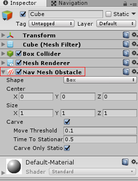 2、创建一个Cube作为动态障碍物,并在Cube挂个NavMeshObstacle组件。