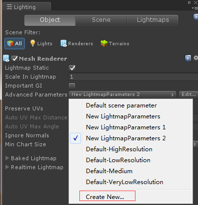 为Cube创建一个LightmapParameters,点击旁边的Edit...按钮。