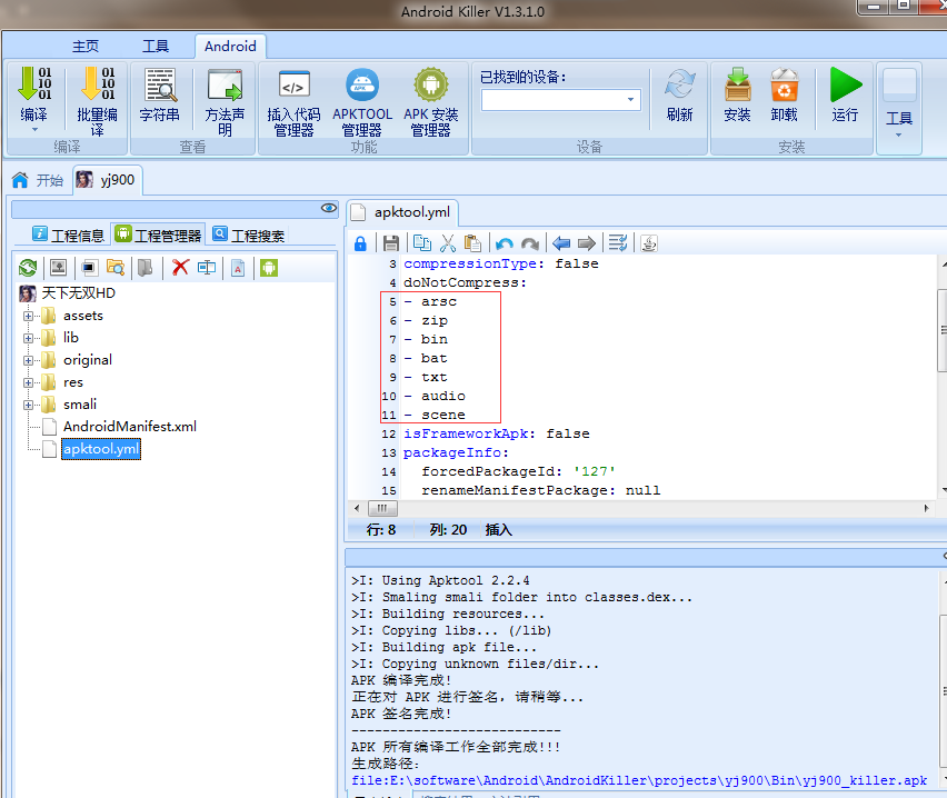 doNotCompress: 下面列举了生成apk时未进行压缩的文件或目录,如果我们希望apktool对这些文件或目录进行压缩,可以从这个列表里删除,然后再回编。如果下面的资源多的话,回编后的apk包体可以减小50%以上。