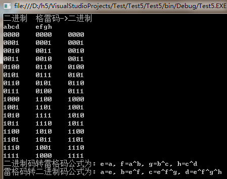 Console.WriteLine("二进制码转雷格码公式为: e=a, f=a^b, g=b^c, h=c^d");